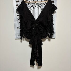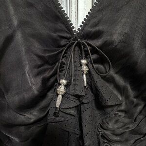 Tags: dark romantic, gothic, draped, ruffle, eyelet, boho, bohemian, v neck, v back, beaded, gathered, pleated, satin, asymmetrical, flouncy, flutter, flowy, unique, interesting, quiet luxury, feminine, flirting, vacation, travel, neutral, mini, tunic