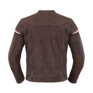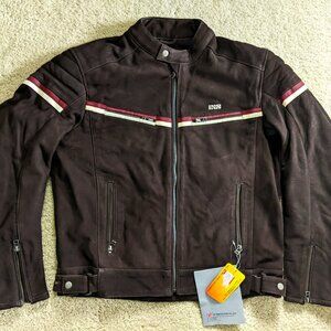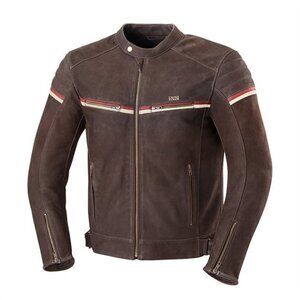 New with Tags - iXS Flagstaff Nubuck motorcycle riding jacket in brown suede-like nubuck leather and burgundy / ivory accent stripes