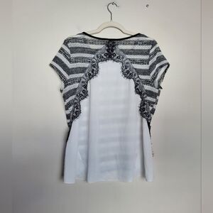 IZ Byer Black White Stripe Mixed Media Blouse Top Lace Knit Semi Sheer Size XL