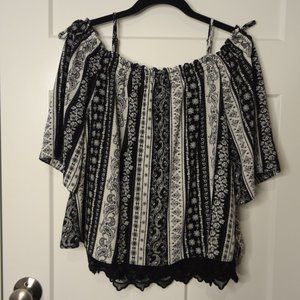 Black and White off shoulder blouse with thin adjustable straps. Floral/ paisley pattern. Silky underlay with lace trim on the bottom. Women's size M