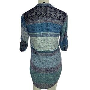 Iz Byer Pullover Blouse 100% polyester Split V-Neck Roll tab short sleeve Curved hem Blue and white pattern with black lace on shoulder