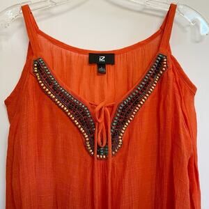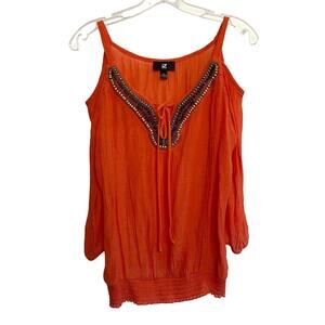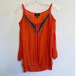 IZ Byer Women's Orange Beaded Front Cold Shoulder Boho Top - L EUC