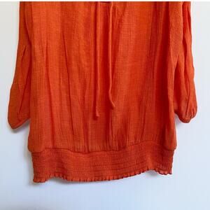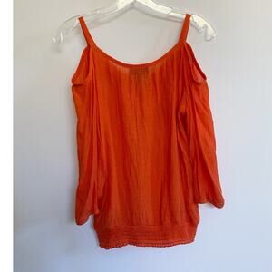 This vibrant orange beaded peasant cold shoulder top features a beautiful beaded neckline with intricate detailing and a smocked hem for a flattering fit. The 3/4 sleeves and lightweight gauze fabric make it perfect for summer, festivals, or casual outings. Embrace the bohemian vibe with this eye-catching piece. Lightweight blouse with open cold shoulder fit. Shoulder straps are fixed (non adjustable). Waist has elastic smocked banding. Great condition! Orange cold Shoulder Top from Iz Byer Boutique.