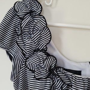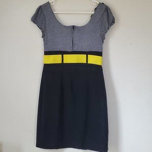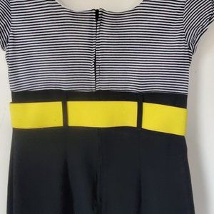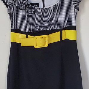 IZ Byer Juniors dress in size 7. This dress has a black and white stripped top with a yellow belt to divide the top from the bottom part of the dress. The bottom part of the dress is solid black. The top is more fitted with a relax bottom. This dress has a very flattering shape to it. This dress is preowned and is in very good condition. The belt is adjustable and can be removed. The top is a square neck and there are ruffled flowers on one side of the sleeve. There is a zipper in the back of the dress. The dress is cut above the knee. Smoke Free Home. Great dress for a business professional or a fun day out.