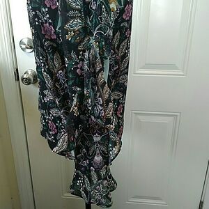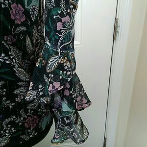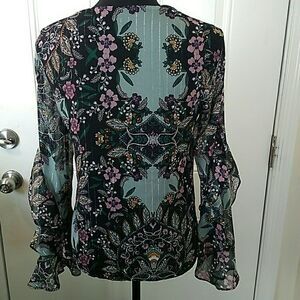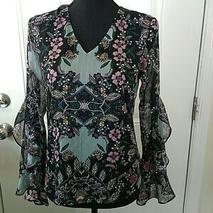 IZ Byer floral print blouse with ruffle sleeve, fully lined, and silver threads running through material.