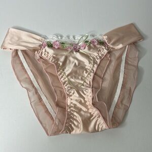 IZA Liquid Satin (Second Skin ) Pink Embroidered Floral Silky Stretch Feminine Panties With Lace Trim & Sheer Mesh Back . Brand NEW. Beautiful satin ribbon bow bowknot trim . Extremely stretchy. Polyamide nylon high spandex blend . Well made . Comfortable. Cotton gusset. So pretty & girlie. Reminds me of a fairy.. very coquette girl style.. obsessed with these.