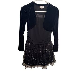 Great condition, minor wear. IZByer California. Formal dress. Square neck. Black top with black and silver metallic dot pattern on chiffon tiered skirt. Black velvet bolero cardigan is attached. Size 16. 100% polyester. Pit to pit laying flat 16” shoulder to hem 31” Sleeve (seam to hem) 20”. All measurements are approximate and taken lying flat. Smoke free home. No trades, offers welcome.