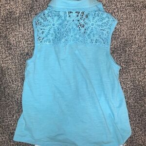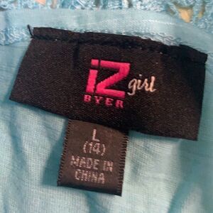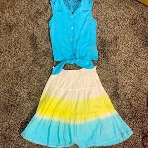 Skirt is blue, yellow, white with elastic waist and crepe look.