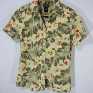 IZOD 100% Silk Vintage S/S Tropical Floral Button Down Shirt. The weight of this shirt is more blouse like for the quality silk construction. Easy to dress up khaki shorts and sandals a bit. Pop on a straw hat and enjoy summer!