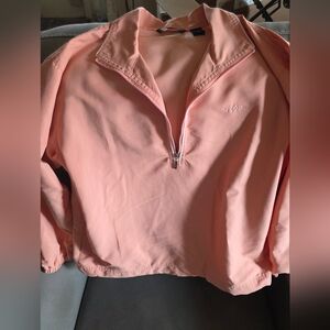 Elevate your casual look with this chic and comfortable IZOD pullover. Made from a lightweight, windbreaker-like fabric, this jacket is perfect for a brisk morning walk, a day of errands, or just lounging at home. The soft peach color is a great pop of color for any season, and the practical quarter-zip design lets you adjust for comfort. It features a spacious front pocket, a stand-up collar, and elastic cuffs for a secure fit. In great condition with no signs of wear.