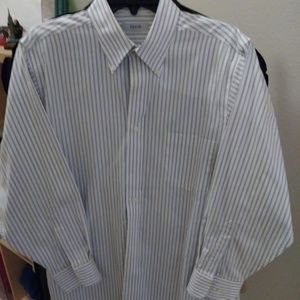 IZOD - Beautiful classic looks - Size is Large 16 32/33 - This classic shirt is white with blue & pale yellow stripes. A staple of any well balanced wardrobe. I wear it with Levi's or Hugo Boss Jeans and black loafers. If need be, I can switch to a navy blue suit and