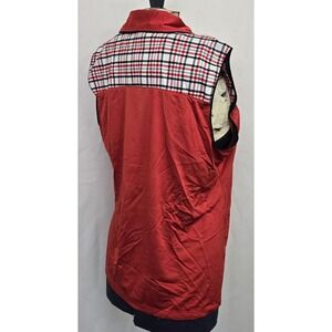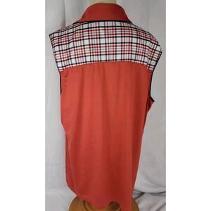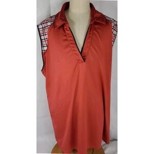 Pre-loved, Excellent condition IZOD Golf sleeveless polo. Performance stretch fabric in a rust/red color with classic plaid trim detail.