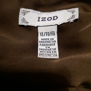IZOD green blouse in size extra large. This blouse is made of 100% polyester and is machine washable. It features button-down closure, roll-tab sleeves, a V-neck, and a front pocket. There is a flaw on the sleeve; please see the pictures for details. It also has a slit on each side at the bottom. The color is darker than it appears in the pictures.
