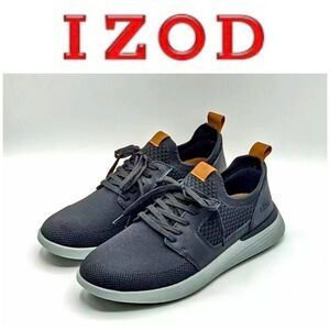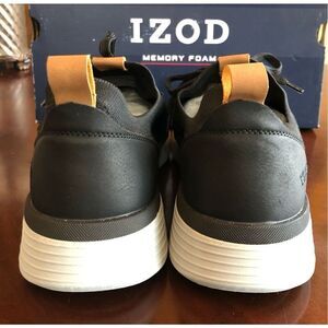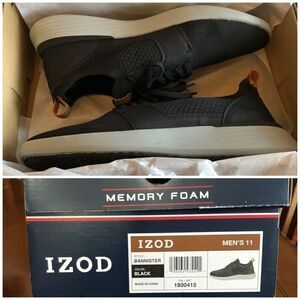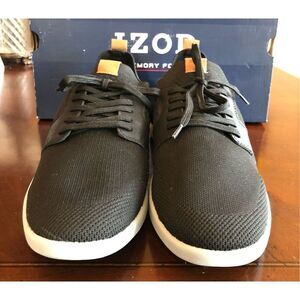 This is IZOD's "Banister" Lace-Up Stretch Sneakers in Classic Black, men's size 11. It's an all black sneaker with a gray outer-sole and brown leather pull-tabs on the heel and the tongue. Lightweight and breathable, these are made with a textile upper, making them easy to slip on and off. Memory Foam footbed for added comfort, and flexible rubber soles provide stability. Made for both comfort and support. A sharp looking sneaker, and they're NWTIB!