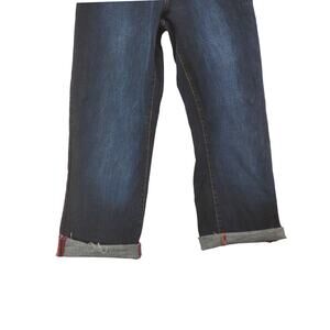 -Features: Stretch denim, dark wash, zipper fly with top button, 5-pocket, back patch, cropped length that can be cuffed