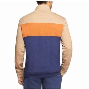 IZOD Men's Slim Fit Advantage Performance Quarter Zip Fleece Pullover Sweatshirt in very nice used condition. The color is Camel Heather Tri-block with flattering colors tan, orange and blue. Take it easy in a fleece made for comfort. Featuring a quarter-zipper design ideal for layering, this pullover is made from stretch fabric with a brushed finish for a supersoft texture yet is also machine washable-so you can say goodbye to the dry cleaner. Measurements are approximately 22” inches underarm to underarm and from shoulder to hem approximately 27” inches.