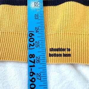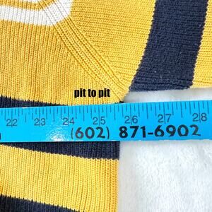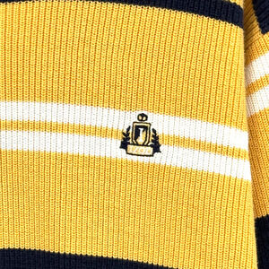 keywords: 100% cotton yellow navy blue & white stripes collegiate style professor casual knitwear logo retro 90's vibe classic ribbed hem cuffs ivy league brand athletic edge streetwear university crewneck scholar