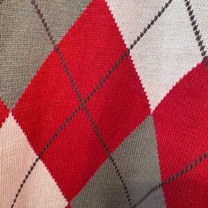 Men’s IZOD sweater in XL, 100% cotton. V-neck style with a classic argyle pattern featuring rust/orange-red, cream, and olive green. A timeless look that’s perfect for fall and Thanksgiving.