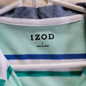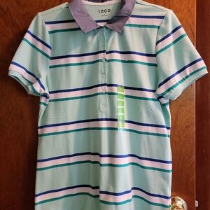 IZOD POLO Aqua Blue and White striped with denim collar Woman's Large