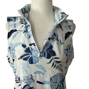 This performance tank top merges sporty functionality with a breezy preppy aesthetic, designed for active days on and off the tennis court. The sleeveless cut and stretch fabric allow effortless movement, while the mock neck and front zip lend a polished edge that feels both athletic and refined. Moisture-wicking and quick-dry technology keep you comfortable through workouts or long afternoons outdoors, and UPF 30 protection adds confidence under the sun. Lightweight and versatile, it channels the ease of athleisure with a coastal resort-inspired influence, making it as suitable for golf or tennis as it is for casual weekends.