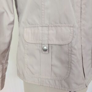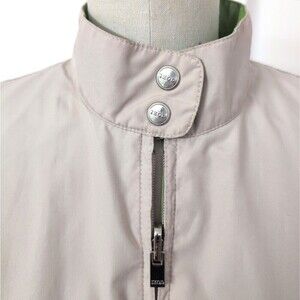 Great convertible and reversible jacket/vest by IZOD. Very classic style in light tan/beige on one size and bright lime green on the other. Material is water resistant (may not be fully water proof). Tan side has snap closure buttons with IZOD mark. Green side has slip pockets. Sleeves are removable to transform jacket into a vest. Very versatile and practical, especially for travel and outdoor use.