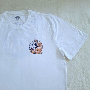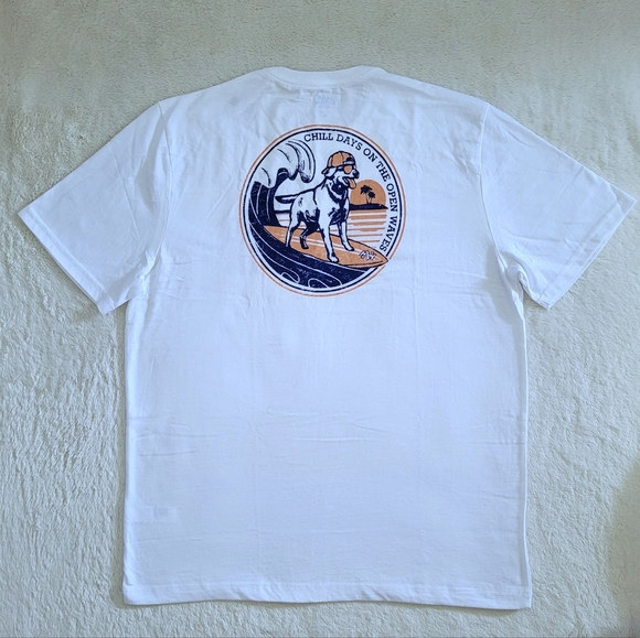 Color of tee👕 is white with a graphic within a circle on back in a slightly distressed light orange🧡 and navy🇺🇲 blue💙 of a yellow💛 labrador retriever🐕 wearing a baseball cap🧢 and sunglasses🕶 on a surfboard🏄♂️; "Chill Days On The Open Waves" along inner circle