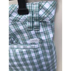 Presenting a stylish pair of IZOD shorts, perfect for casual outings and golf courses. With a plaid pattern and green color, these Bermuda shorts have a flat front and a 10" inseam. The woven polyester fabric with a zipper closure and button accents gives a comfortable fit. These shorts have a regular fit and are available in size 36.