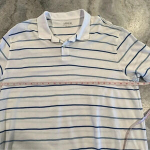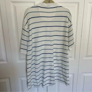 White polo with navy stripes and light blue stripes, collared, button neckline, excellent condition.