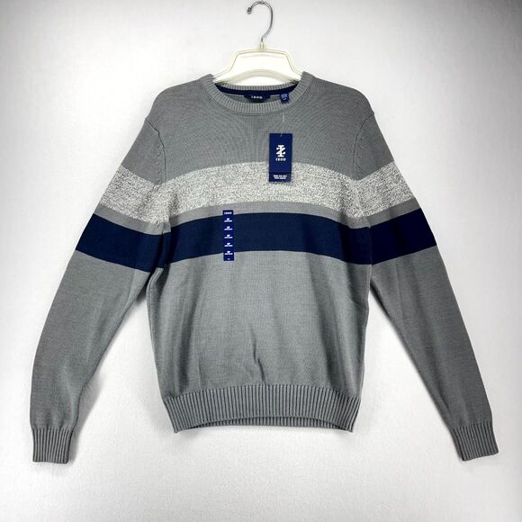 IZOD Woods Cove Chest Stripe Sweater Crew Neck Med Gray Heather Mens Size S NEW
