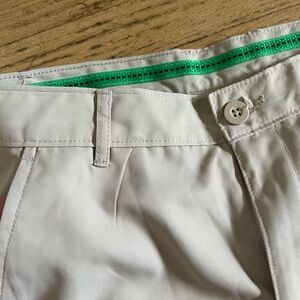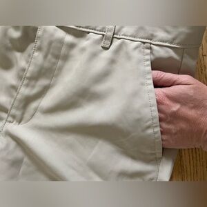 These golf shorts are made of flexible quick drying wrinkle release fabric. They have a non slip waistband. Stylish and comfortable men's tan shorts, perfect for casual outings. These shorts are perfect for any occasion. They are in excellent used condition.