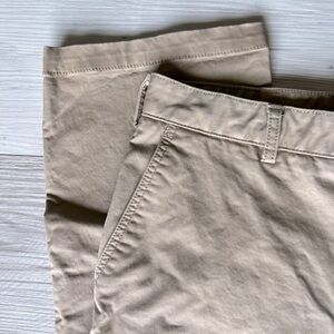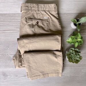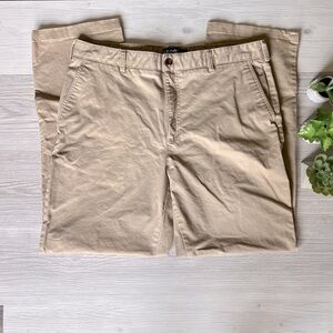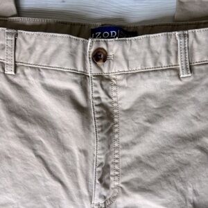 IZOD khaki pants. Straight fit. Mens waist 36. Khaki color. Belt loops. Slide slit pocket at each hip. Back pockets with button closure. Zipper with top button closure.