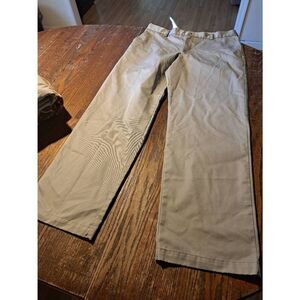 Good used condition men’s IZOD American Chino straight fit pants in size 36x32. Khaki/tan color, flat front style with belt loops and pockets. Style 453008, season B2015. 100% cotton.
