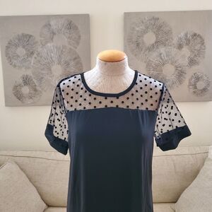 Featuring a mesh polka dot neckline panel and short sleeves, this playful shift dress provides light, versatile style for sunny days.