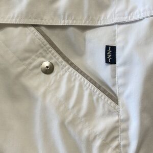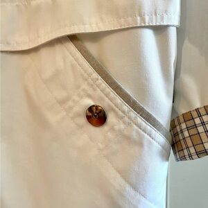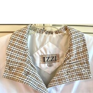 IZZI, WOMENS, SUMMER, LIGHTWEIGHT JACKET. WHITE WITH BROWN PLAID COLLAR & CUFFS. SNAP BUTTON CLOSURE, 2 LARGE FRONT POCKETS WITH BROWN DETAIL & SNAP CLOSURE, DRAWSTRING BOTTOM. IN NEW CONDITION. SIZE L