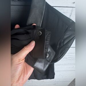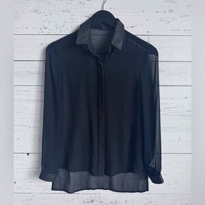 black sheer top is perfect for any occasion. Faux leather collar and wrist trim. This sophisticated design offers a chic and timeless look. Pair it with your favorite bottoms for a complete outfit.