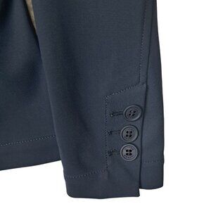 Female four-button show jacket in navy blue is tailored for a feminine, athletic look. Four-way stretch microfiber is moisture wicking, quick drying, breathable, and lightweight. Jacket is unlined but the fabric is substantial enough to look more structured without sacrificing comfort and performance. Elegant riding coat has a double vent in back and two functional flap pockets in front.