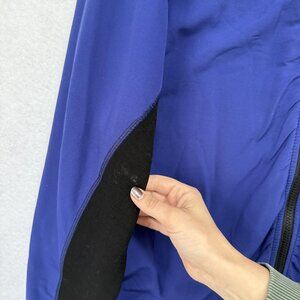Light wear with cosmetic signs of use. Multiple small snags/pulls noted on the blue fabric at sleeve and shoulder areas; light pilling and some lint on the knit cuffs and black side/back panels; minor marks near the chest pocket. Zippers tested and functioning. No major damage observed. Please review photos for close-ups of flaws.