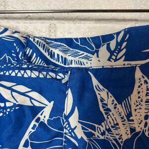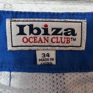Ibiza Ocean Club Men's Swim Trunks Blue Aloha White Floral Hibiscus Size 34. Adjustable waist with two side buttons on each side. Zip fly double snap Waist closure. Two hip side/pockets and one rear zipped closed secure pocket. Quick dry polyester, blue & white hibiscus print. Easy care: machine washable. Pre-owned, normal wear.