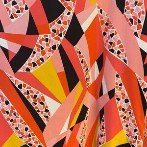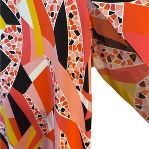 Embrace a relaxed style with this collared, button down shirt, featuring a striking orange, pink and black graphic design. The long sleeves and notched collar add a touch of sophistication, making it a versatile addition to your wardrobe. Perfect for casual outings, this top combines comfort with a bold, artistic flair.