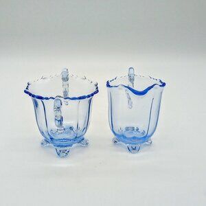 Delicate ice blue glass footed mini sugar and creamer set with scalloped rim and swirled handles.