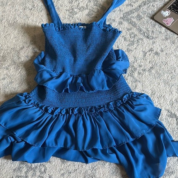Elegant blue dress with ruffle accents. Features a sleeveless design and striped pattern.