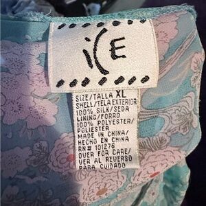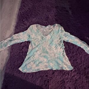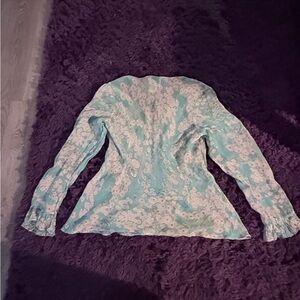 Elegant blouse with floral design. Features blue and white hues. Perfect for any occasion.