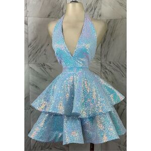 Get ready to shine bright like a diamond in our Icy Blue Iridescent Sequin Halter Mini Dress! This stunning dress features a halter neckline, a body-hugging fit, and shimmering sequins that catch the light from every angle. Perfect for a night out on the town or a special event, this dress will have you feeling like the belle of the ball. Flaunt your style and confidence in this show-stopping piece!