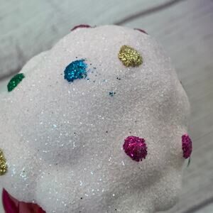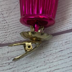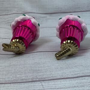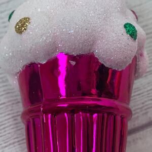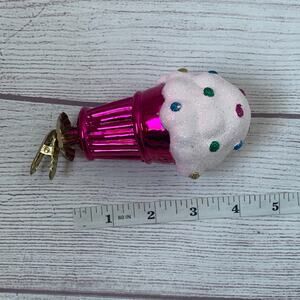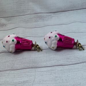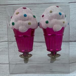 Retro ice cream cone Christmas ornaments. These ornaments are made of plastic. They have a metallic pink cone and a white or very light pink glittery top with multi-color spots of confetti. The bottom has a clip for clipping on the branches. They are pre-owned, with light manufacturing imperfections in the paint and glitter but are in great condition. They come in a plastic box that has scratches on it.
