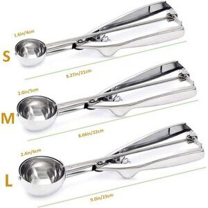 🧿【MULTI USES】The cookie scoop set includes: Small size ( bowl diameter: 1.6inch/4cm, 1.2Tbsp/23ml/0.8oz). Medium size (bowl diameter: 2inch/5cm, 2.6Tbsp/42ml/1.4oz). Large size (bowl diameter: 2.4inch/6cm, 4Tbsp/60ml/2.4oz). They can be ice cream scooper, cookie scooper, cupcake scoop, meatball scoop, melon baller scoop, measure spoon. You can use the cookie scoops easily to create different size balls of ice cream, cookie dough, muffin, meatballs, mashed potatoes, melon and other fruits sorbet.