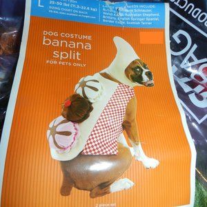Your dog will look adorable in this very soft and plush, high-quality costume. The two-piece costume includes a padded banana split that fits on your dog's back with two large hook and loop straps to go around your dog's chest and belly. The costume also includes a matching headpiece with two eyes and a soft hook and loop strap that goes around your dog's neck.