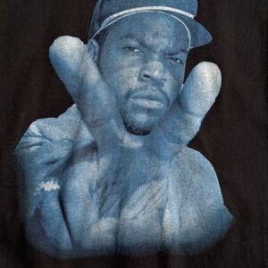 Hard-to-find Ice Cube graphic tee with a bold oversized blue-toned photo print on a true black base. West Coast legend pose in your face — iconic 90s energy. Lightweight cotton feel with a tagless printed collar that reads “ICE CUBE” and size M.