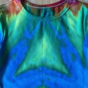 One-of-a-kind hand-dyed dress in a vibrant burst of rainbow colors. Dress was dyed using a unique accordion style fold. Dress is bodycon/form fitting style but is made of very soft material for comfort. I used procion dyes so the colors will stay bold wash after wash.