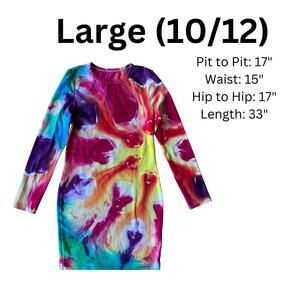 One-of-a-kind hand-dyed dress in a vibrant burst of rainbow colors. Dress was dyed using a drippy rainbow mandala style. Dress is bodycon/form fitting style but is made of very soft material for comfort. I used procion dyes so the colors will stay bold and vibrant wash after wash.