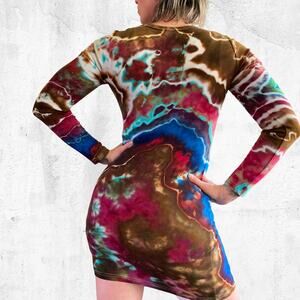 Ice-dyed long-sleeve bodycon dress that will definitely get you noticed in a crowd. Earthy tones with a pop of vibrant color dyed in a geode pattern. Dress is very soft (viscose and elastane), flattering yet comfortable. I used procion dyes so the colors will stay bold and vibrant!